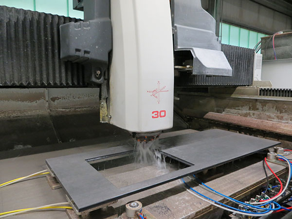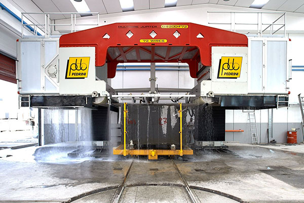 Diamantbestückte Rundblätter, auf einer Achse gelagert und hintereinander angebracht, zerteilen den Block in Streifen. Ein horizontal gelagertes Diamantblatt trennt diese vom Block ab und legt sie zur weiteren Bearbeitung – Schleifen, Polieren und Formatieren – auf eine weitere Fertigungsstrasse.