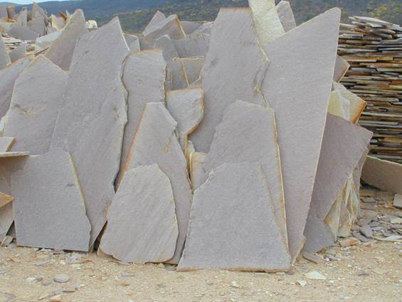- Schichtengesteine wie z.B. viele Quarzite oder einige Kalksteine sind Spaltmaterialien und werden maschinell mit Hämmern oder zum Teil noch mit Hand abgebaut und diese als Polygonalplatten oder weiterverarbeitet zu verschiedenen Formaten vermarktet.